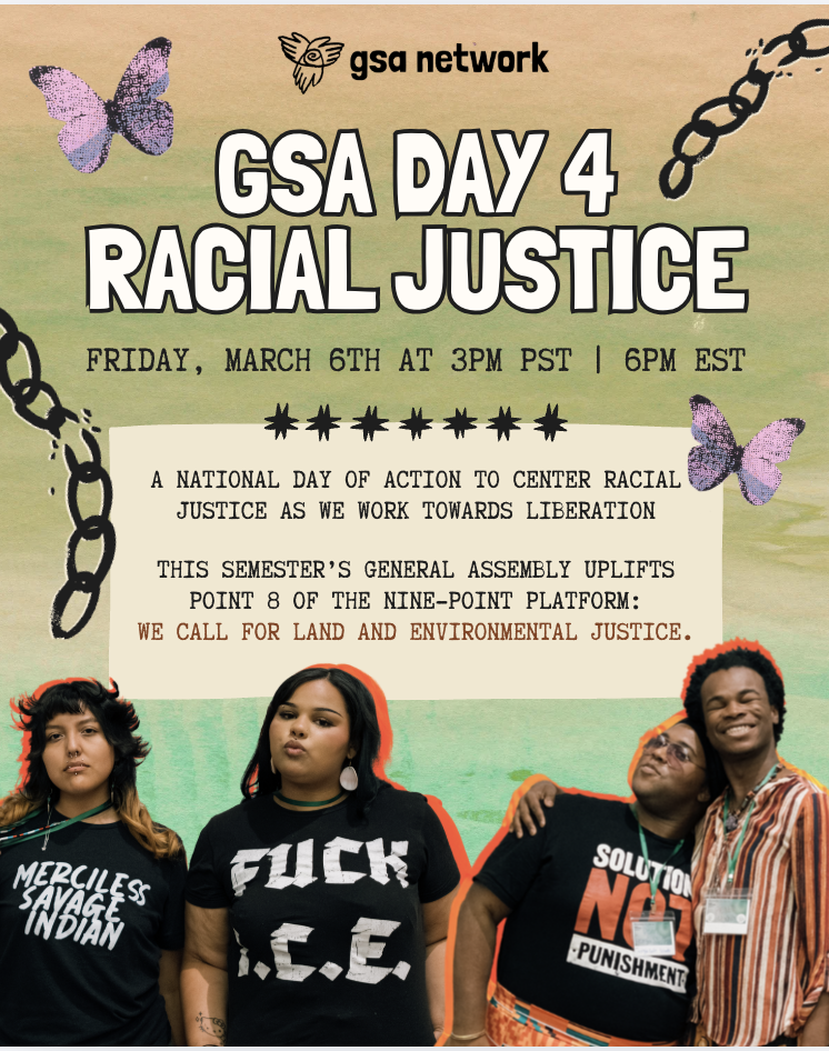 This year’s GSA Day for Racial Justice centers Point 8 of the Nine-Point Platform: “We Call for Land Justice and Environmental Justice.” We’re spotlighting the inseparable connection between racial justice and our planet because the exploitation of land, water, and air doesn’t happen in a vacuum. It’s rooted in white supremacy and colonization, disproportionately harming Black, Indigenous, and communities of color. Our collective liberation requires healing our relationship with the Earth and dismantling the extractive systems that poison both our environment and our futures.