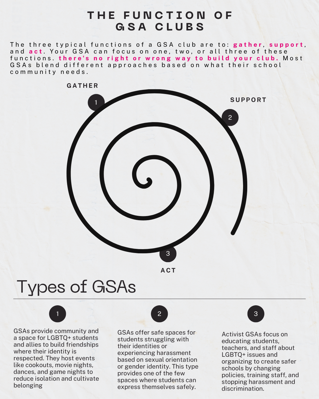Your GSA can gather, support, and act. You can focus on one area, combine approaches, or do all three - there's no right way to build your club. Most GSAs blend different functions based on what their school community needs.